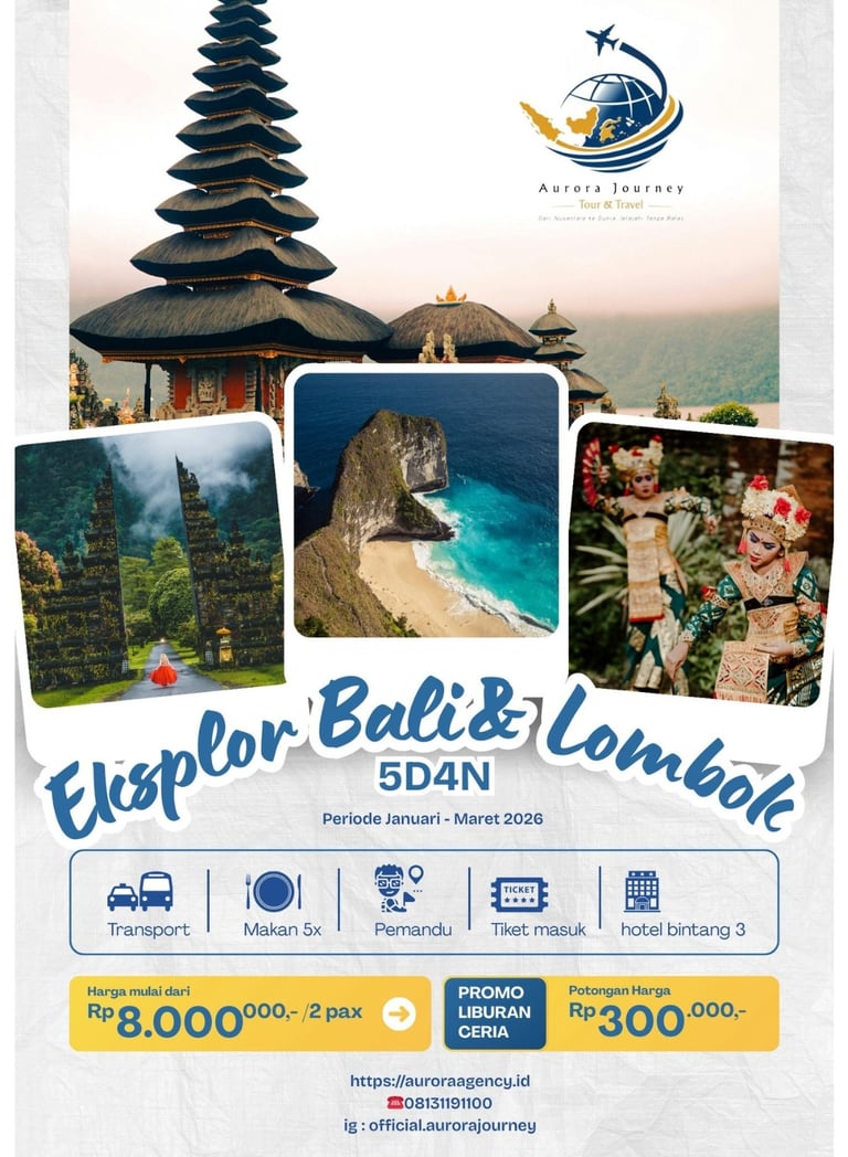 Rasakan pengalaman perjalanan eksklusif menyusuri keindahan Bali dan Lombok β dari panorama alam yang menakjubkan hingga kekayaan budaya yang memesona. Setiap momen dirancang khusus untuk menghadirkan kenyamanan, kemewahan, dan kenangan tak terlupakan.