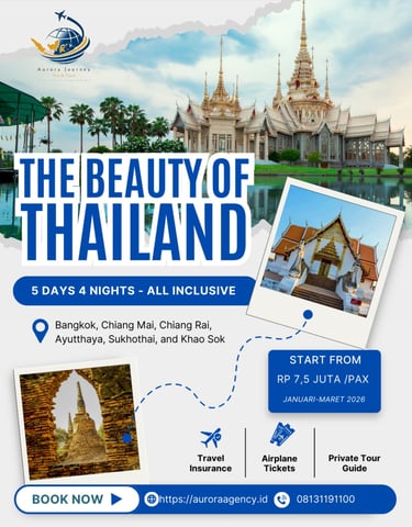 Jelajahi keindahan Thailand dalam perjalanan yang dirancang secara eksklusif.Dari megahnya kuil hingga pesona alam yang menenangkan, setiap momen dipersiapkan untuk menghadirkan kenyamanan, keanggunan, dan kenangan tak terlupakan. Sebuah liburan berkelas, tempat budaya, alam, dan pengalaman mewah berpadu sempurna.β
