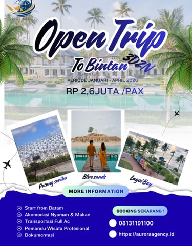 Nikmati kemewahan sederhana di Bintan β pantai bersih, resort menawan, dan suasana eksklusif yang menenangkan jiwa. Bersama Aurora Journey, setiap momen dirancang untuk menghadirkan kenyamanan, romantisme, dan kesan liburan berkelas.