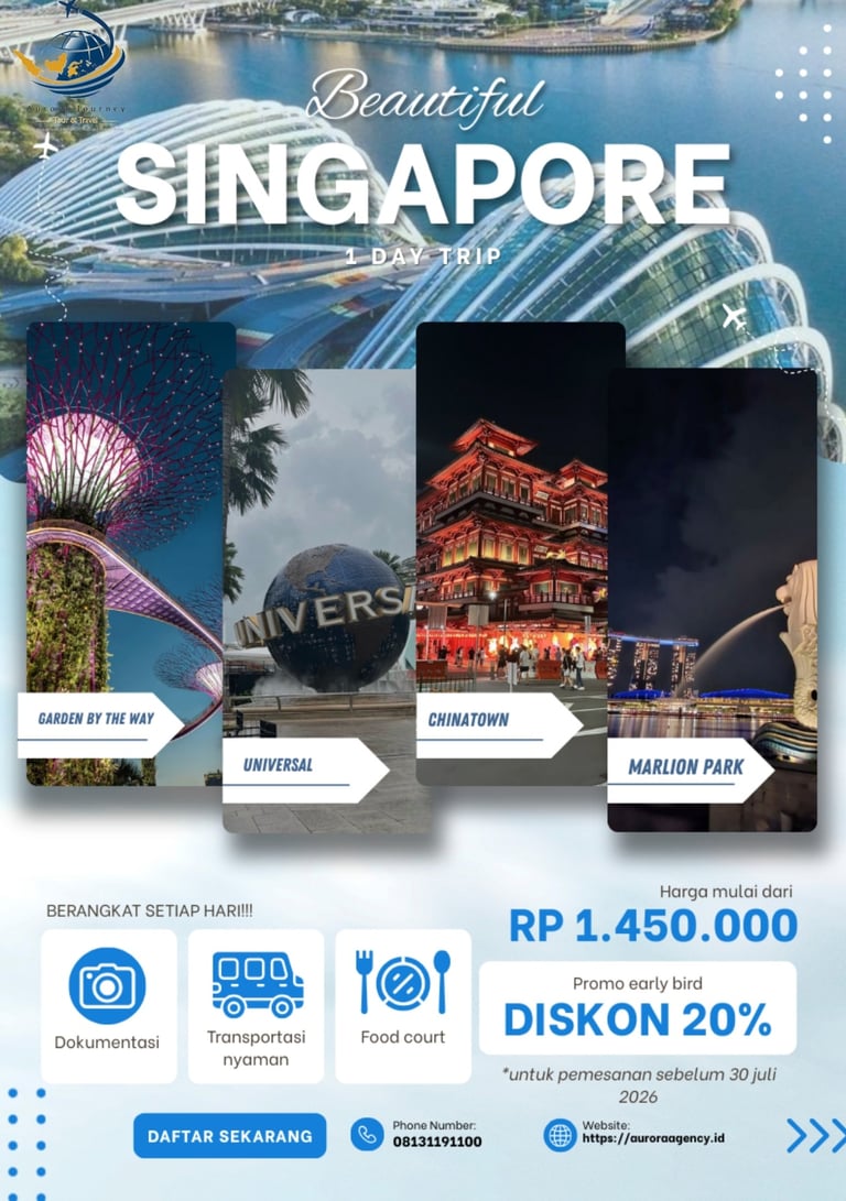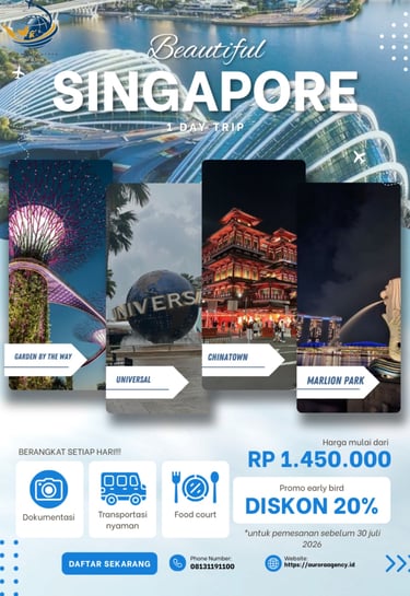 Nikmati pesona Singapura dalam satu hari perjalanan eksklusif bersama Aurora Journey. Dari keindahan futuristik Gardens by the Bay, kemegahan Marina Bay, hingga atmosfer ikonik Universal Studios dan Chinatown β setiap momen dirancang untuk menghadirkan pengalaman singkat yang berkelas, nyaman, dan berkesan.
